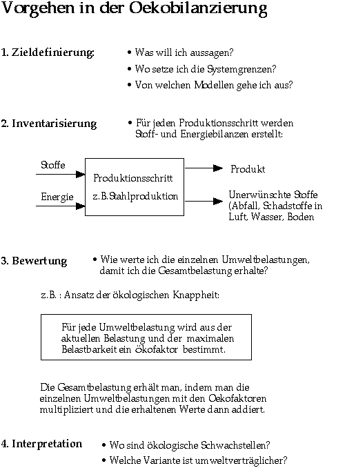 Um die Frage nach der Umweltverträglichkeit beantworten zu können, muss somit der Lebenszyklus "von der Wiege bis zur Bahre" auf sämtliche Umwelteinwirkungen untersucht werden. Zu diesem Zweck wurde das Instrument der Oekobilanzierung entwickelt.