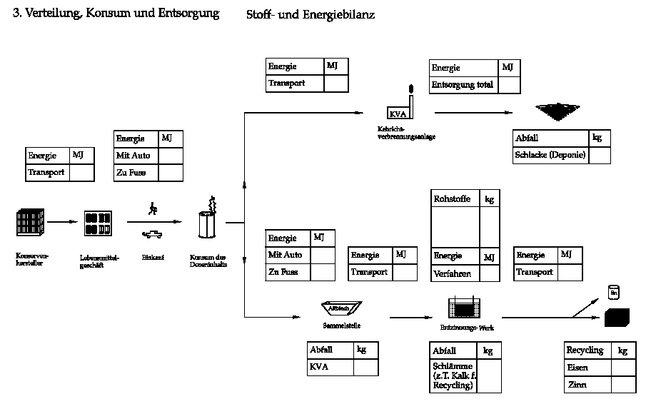 Die durchschnittliche Distanz, die eine Konservendose vom Lager des Konservenherstellers bis ins Regal des Lebensmittelgeschäfts zurücklegt, beträgt etwa 200 km, von denen 150 km auf die Schiene und 50 km auf die Strasse entfallen. Bei einem durchschnittlichen Treibstoffverbrauch eines Lastwagens von 30 l pro 100 km und 50%iger Nutzlast beträgt der Gesamtenergieaufwand für 100 Konservendosen:
