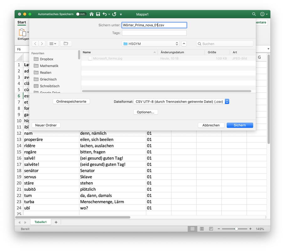Oft stehen diese Daten schon zur Verfügung, und es macht keinen Sinn, sie einzeln einzutippen. Zu diesem Zweck bieten viele Tools (z.B. Quizlet) eine Importmöglichkeit. Für einen reibungslosen Import müssen die Daten in einem geschickten (strukturierten) Format vorliegen, z.B. dem CSV-Format, welches beispielsweise von Excel erzeugt werden kann. Aus der Tabelle:
