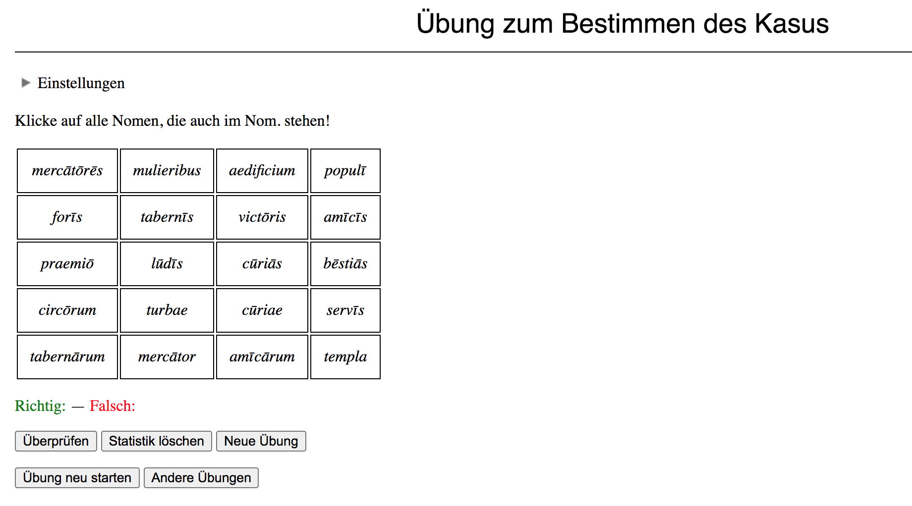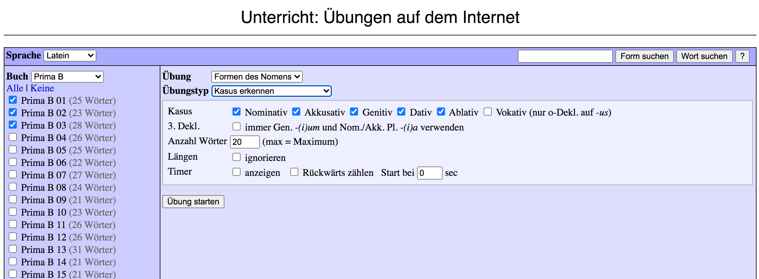 Auf der Website von Lucius Hartmann findet sich eine Reihe von Übungen zu Vokabeln, Formen, Syntax und Metrik für die meisten Lehrmittel, die im Latein- und Griechischunterricht momentan eingesetzt werden. Es stehen auch Tools zur Erstellung von Übungsblättern und Kreuzworträtseln sowie zum Durchsuchen von Onlinewörterbüchern zur Verfügung.