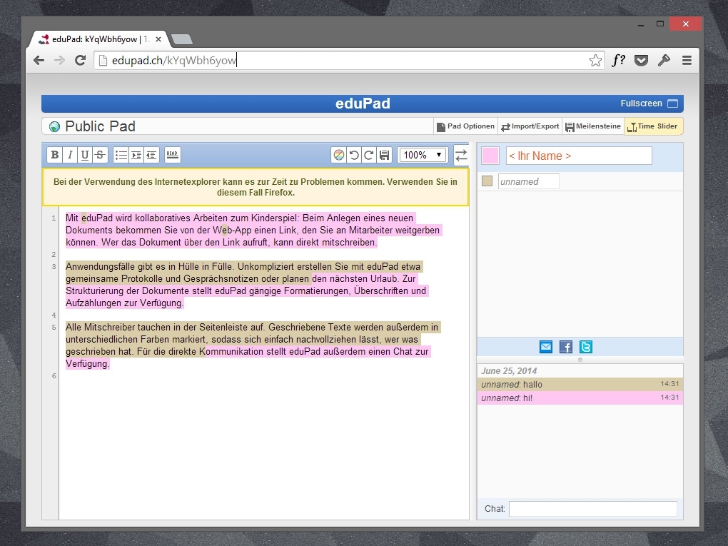 eduPad ist ein kollaborativer Texteditor. Bis zu 15 Personen können damit online gleichzeitig ein Textdokument bearbeiten.