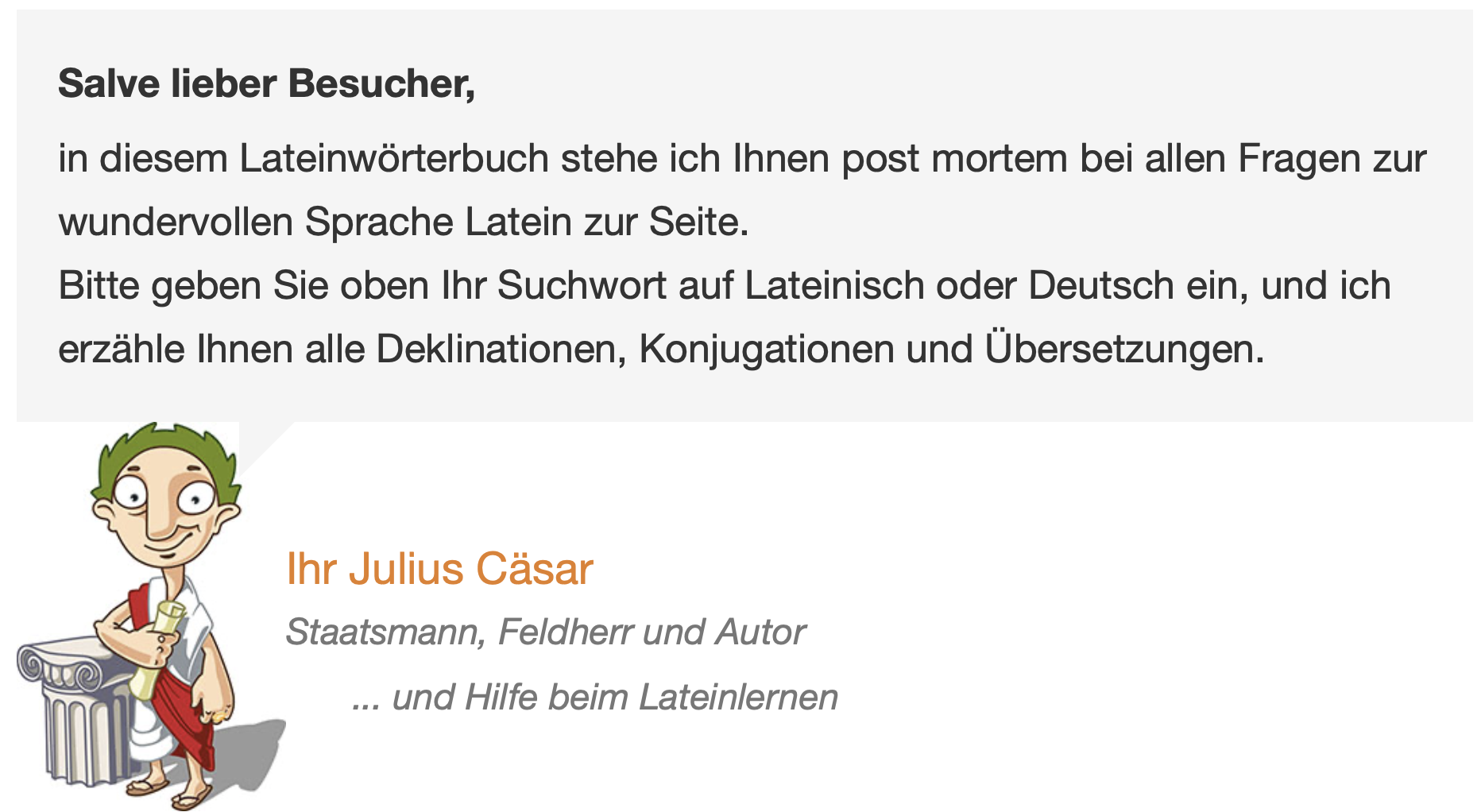 "In diesem Lateinwörterbuch stehe ich Ihnen post mortem bei allen Fragen zur wundervollen Sprache Latein zur Seite. Bitte geben Sie oben Ihr Suchwort auf Lateinisch oder Deutsch ein, und ich erzähle Ihnen alle Deklinationen, Konjugationen und Übersetzungen. Ihr Julius Cäsar Staatsmann, Feldherr und Autor... und Hilfe beim Lateinlernen" (Selbstbeschrieb)