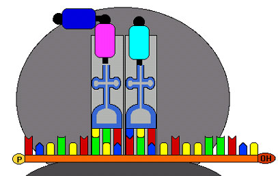 Siehe Proteinbiosynthese Animation in http://www.westga.edu/~lkral/prtsynth/prtsynth.mov