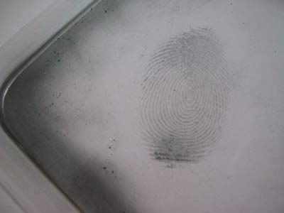 Small Particle Reagent Prinzip: Das in einer Flüssigkeit suspendierte Molybdänsulfid setzt sich auf den fetthaltigen Fingerabdrücken fest. An den übrigen Stellen der Unterlage bleibt das MoS2 nicht haften. Eignung: Materialien mit glatter Oberfläche, wie Glas, Kunststoffe, Porzellan. Das Material darf nicht durch Wasser beschädigt werden. Geräte: Grösseres Glasgefäss Chemikalien: MoS2, Tergitol NP7 (Polyglycolether – ein nichtionisches Tensid, Sigma) Vorgehen: 1 Liter Leitungswasser wird mit 0,8 ml Tergitol und 10g MoS2 vermischt. Man giesst die Lösung in ein grösseres Gefäss, rührt gut durch und taucht das Objekt in die Suspension hinein. Bereits nach kurzer Zeit werden die Abdrücke sichtbar. Es ist vorteilhaft, die Abdrücke direkt in der Flüssigkeit zu fotografieren, da beim Herausnehmen der Probe das Pulver oft wieder weggespült wird.