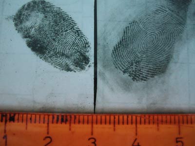 Iod Prinzip: Das unpolare Iod wird in den Fettbestandteilen des Schweisses gelöst. Die Abdrücke müssen wegen der Feuchtigkeit von Iod entweder sofort fotografiert werden oder durch Reaktion mit -Naphtoflavon fixiert werden (alpha-Naphtoflavon bildet mit Ion eine blauviolette Adsorbtionsverbindung). Eignung: Papier, Karton und andere poröse Oberflächen, liefert jedoch bei glatten Oberflächen auch gute Ergebnisse. Geräte: Uhrglas, Exsikkator, Abzug. Chemikalien: Iod, alpha-Naphtoflavon (Fluka, purum), 1,1,2-Trichlortrifluorethan (Chromasolv, Riedel de Haen), Essigsäure Vorgehen: Herstellung des Fixierers: 0,1 g alpha-Naphtoflavon werden mit 5 ml Essigsäure und 30 ml 1,1,2-Trichlortrifluorethan gemischt. Ein kleines Uhrglas mit Iod wird auf den Boden des Exsikkators gelegt. Die Probe wird danach in den oberen Bereich des Exsikkators hineingelegt und das ganze Gefäss in einem Wasserbad erwärmt. Nachdem ein guter Kontrast erreicht worden ist, besprüht man die Probe mit der Fixierlösung. Achtung: Wegen der Giftigkeit von Iod sollte die Arbeit in einem Abzug durchgeführt werden.