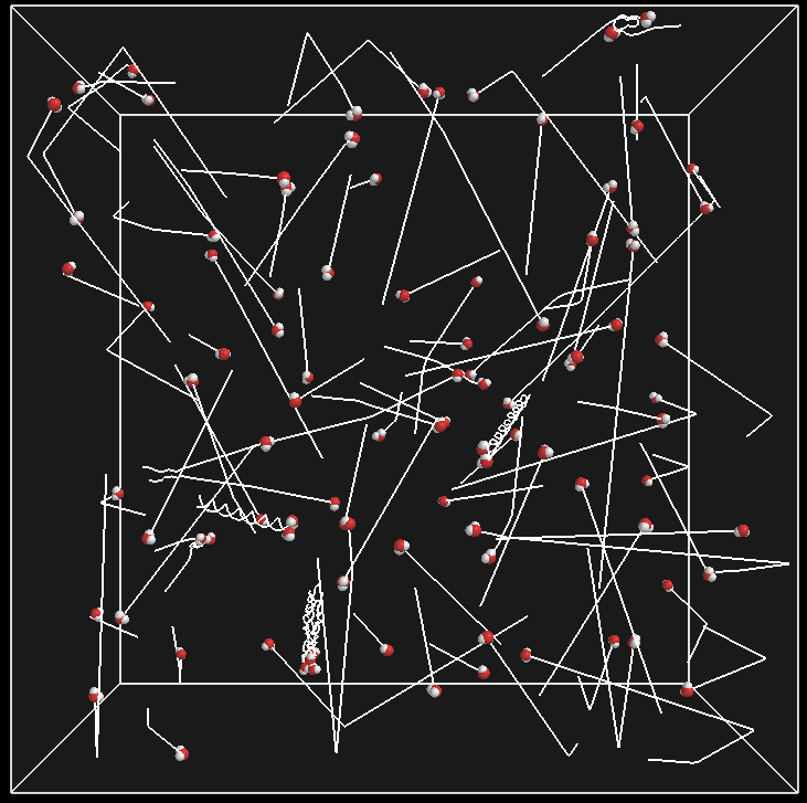 Abb 2. Pfade der O-Atome während einer kurzen Simulationszeit in flüssigem Eis. Einige Moleküle haben sich während der Simulationszeit nicht mehr bewegt, als die Wassermoleküle in festen Eis. Andere aber haben sich offenbar von einer oder zwei Wasserstoffbrücken losgerissen und bewegen sich relativ weit durch die Probe.¶