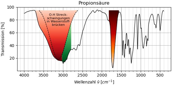 IR-Spektrum und Schwingungen von Propansäure (Propionsäure). Die Farben der Buttons entsprechen den Farben im Spektrum: Die Schwingungen, die erscheinen, wenn die Buttons gedrückt werden, haben die entsprechenden Frequenzen im Spektrum.