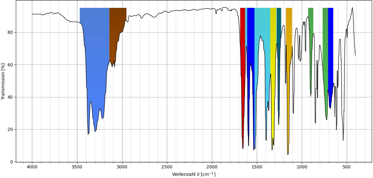 IR-Spektrum und Schwingungen von 4-Acetamidobenzensulfonamid (Synonyme: N-(4-Sulfamoylphenyl)acetamid, Acetylsulfanilamid, Neotherapol). Die Farben der Buttons entsprechen den Farben im Spektrum: Die Schwingungen, die erscheinen, wenn die Buttons gedrückt werden, haben die entsprechenden Frequenzen im Spektrum.