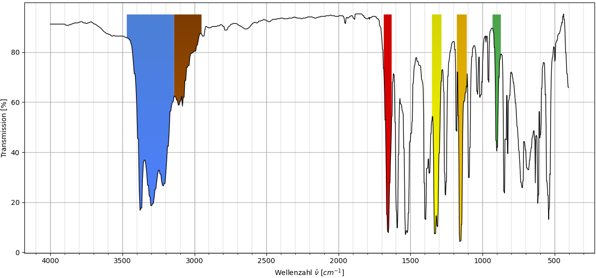 IR-Spektrum und Schwingungen von 4-Acetamidobenzensulfonamid (Synonyme: N-(4-Sulfamoylphenyl)acetamid, Acetylsulfanilamid, Neotherapol). Die Farben der Buttons entsprechen den Farben im Spektrum: Die Schwingungen, die erscheinen, wenn die Buttons gedrückt werden, haben die entsprechenden Frequenzen im Spektrum.