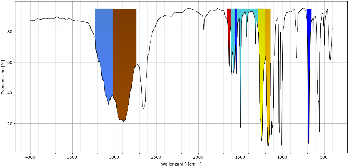 IR-Spektrum und Schwingungen von 4-Acetamidobenzensulfonylchlorid (Synonym: N-Acetylsulfanilylchlorid). Die Farben der Buttons entsprechen den Farben im Spektrum: Die Schwingungen, die erscheinen, wenn die Buttons gedrückt werden, haben die entsprechenden Frequenzen im Spektrum.