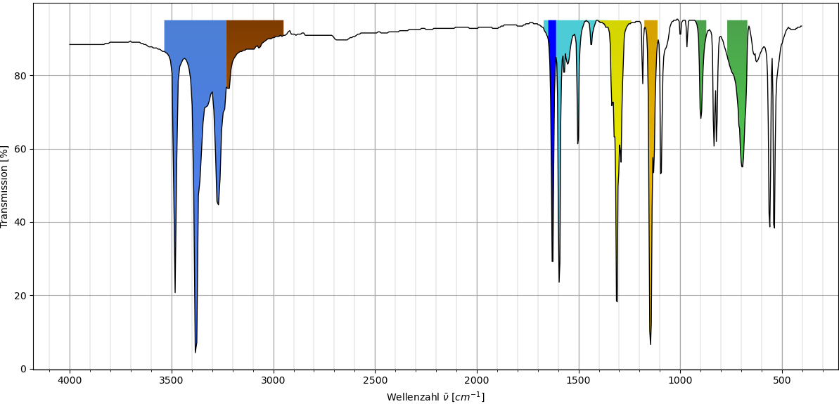 IR-Spektrum und Schwingungen von Sulfanilamid. Die Farben der Buttons entsprechen den Farben im Spektrum: Die Schwingungen, die erscheinen, wenn die Buttons gedrückt werden, haben die entsprechenden Frequenzen im Spektrum.