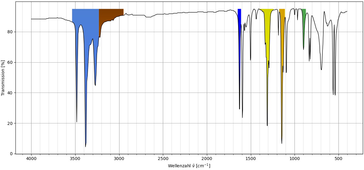 IR-Spektrum und Schwingungen von Sulfanilamid. Die Farben der Buttons entsprechen den Farben im Spektrum: Die Schwingungen, die erscheinen, wenn die Buttons gedrückt werden, haben die entsprechenden Frequenzen im Spektrum.