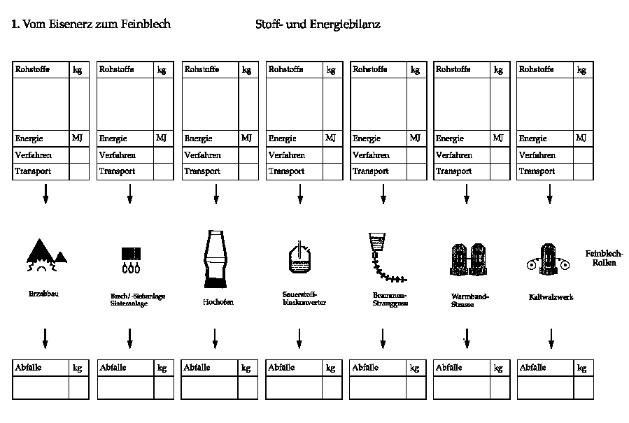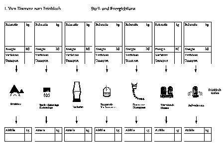 * Führen Sie für die einzelnen Produktionsschritte vereinfachte Energie- und Stoffbilanzen durch. Vervollständigen Sie zu diesem Zweck das Lösungsblatt am Schluss der Unterlagen mit den Rubriken Rohstoffe, Energie (Verfahrens- und Transportenergie) sowie Abfälle. Die dazu notwendigen Zahlen können Sie den Texten entnehmen.