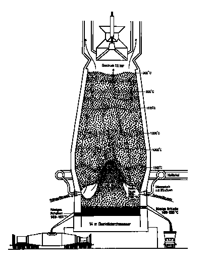 von oben in den bis zu 35 m hohen Hochofen eingebracht. Die notwendigen