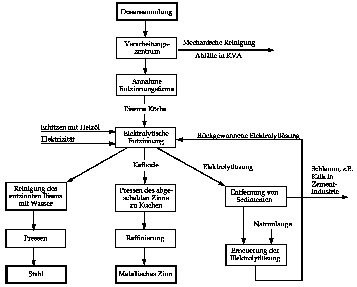 Das Zinn wird dabei zunächst oxidiert und gelöst und anschliessend an der negativen Elektrode als Metall abgeschieden. Die Elektrolytlösung ist dabei in einem geschlossenen Kreislauf: Sie wird nach der Zugabe von Natronlauge und Kalkhydrat und der Reinigung von Schlämmen wiederverwendet. Es fällt somit kein Abwasser an. Lediglich das verdunstete Wasser wird ersetzt. Die Schlämme bestehen weitgehend aus Kalziumcarbonat (Kalk) und können in der Zementindustrie wiederverwendet werden. Sie enthalten allerdings problematische Stoffe - beispielsweise Ueberreste der inneren Lackschicht von Dosen.