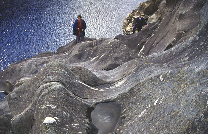 P-forms carved by ice abrasion and subglacial meltwater during the last glaciation (10,000 years ago) at Loch Treig, Grampian Highlands, Scotland. Photo M. J. Hambrey. |