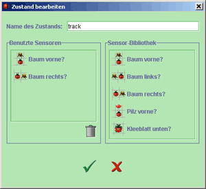 So wird Kara programmiert. Im oberen Teil des Programmeditors wird per Mausklick der endliche Automat zur Steurung von Kara festgelegt. Kara verfügt über verschiedene Sensoren, mit denen er seine unmittelbare Umgebung wahrnehmen kann. Im unteren Teil des Programmeditors wird bestimmt, welche Aktionen Kara in Abhängigkeit von seinen Sensorwerten ausführen soll.