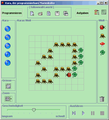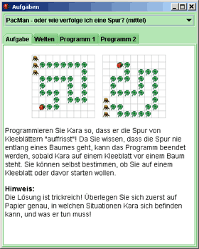 Der Einstieg in die Programmierung mit Kara ist einfach. In der Programmierumgebung sind verschiedene Aufgaben samt Lösungen integriert.
