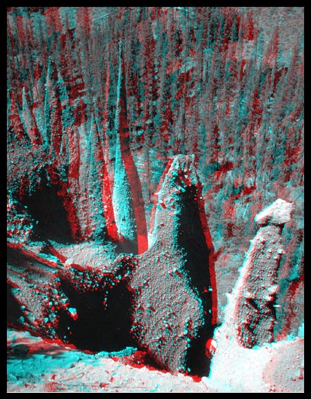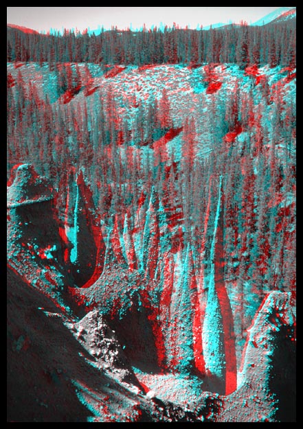 Heute sind die Canyons rund um Crater Lake tief in pyroklastische Ablagerung der grossen Eruption vor rund 7000 Jahren hinein erodiert. Ungleichmässige Verwitterung und Abtragung führten zur Bildung spektakulärer Formationen. Der markante Turm links ist durch Erosion von Regen und den Schutz des Steins entstanden, der nun obenauf sitzt. Andere Türme mögen sich dadurch gebildet haben, dass aufsteigende Fumarolengase zur lokalen Verhärtung des Lockermaterial führten. Hier sind 3D-Ansichten anderer Türme (Sie bemötigen rot-blaue Brillen um den stereoskopischen Effekt zu sehen): Stereobild 1 | Stereobild 2 |