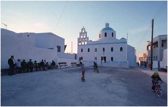 Mentre i turisti si affannano al rito del tramonto, i vecchi del paese si godono i ragazzini che sbiciclettano sulla piazza della cattedrale di Oia.