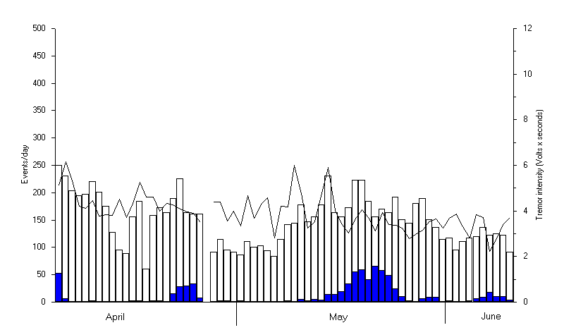 The second half of May was in any case characterized by a reprise of the activity, both in terms of the total number of recorded events and of the number of major ones (saturating the acquisition system with ground velocities exceeding 100 µm/s). Also the limitations imposed by local authorities to the access of the tourists to the volcano were reduced. The beginning of June shows a new slight decrease of the seismic activity, which is now characterized by a fairly constant number of events (100-150 per day) and very few major shocks. During all the period examined in this report, the tremor intensity showed a very slight decreasing trend in its usual oscillations.