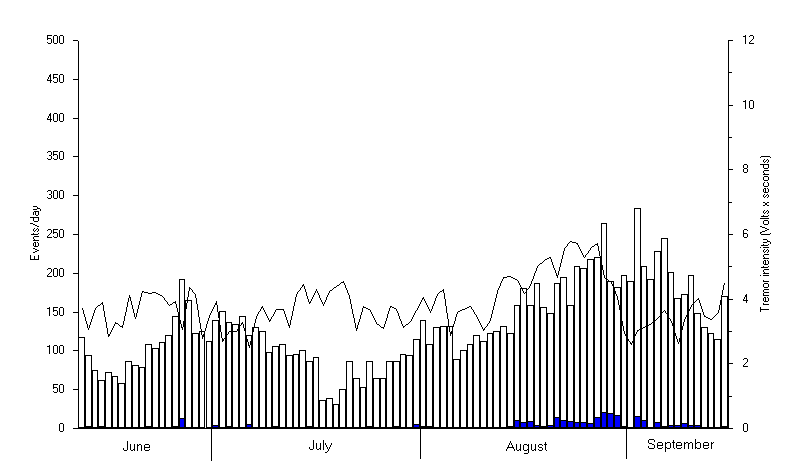 The total number of recorded events showed a rise and subsequent decrease during the period mid June - mid July, with two minima of 50-60 events per day and a maximum of almost 200 events per day recorded on 26 June. Another rise followed starting mid-July, reaching values of 260-280 events on 28 August and 3 September, in correspondance of the significant tremor decrease described above.