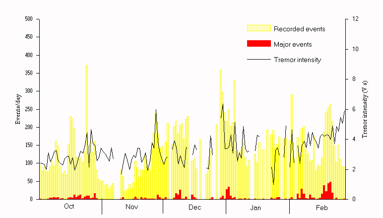 A drop in the seismic activity at the end of January was followed by a growth of all parameter during the month of February, with the number of events again exceeding 250 per day on 20 and 21 February, sand aturating events concentrating in the period 17-22 February, with a peak of 44 and 48 saturating events on the same days 20 and 21 February. The tremor intensity showed a slower but more steady grow, starting from values slightly above 2 V.s at the beginning of the month, and ending with values near 6 V.s at the end.