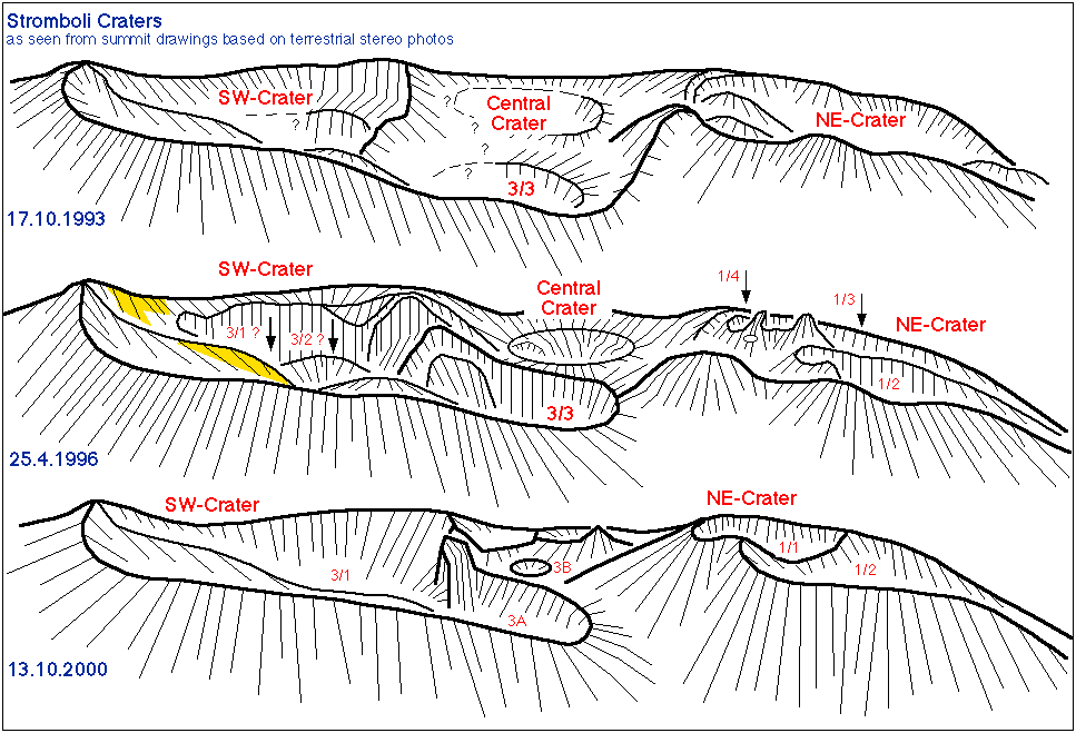 Figure 2. Different sketch maps of Stromboli's Crater Terrace drawn on the base of terrestrial stereo photos in 1993, 1996, 2000. These highlight the changes in the morphology of the crater area during these seven years. Other maps and sketches can be found on Stromboli online website.